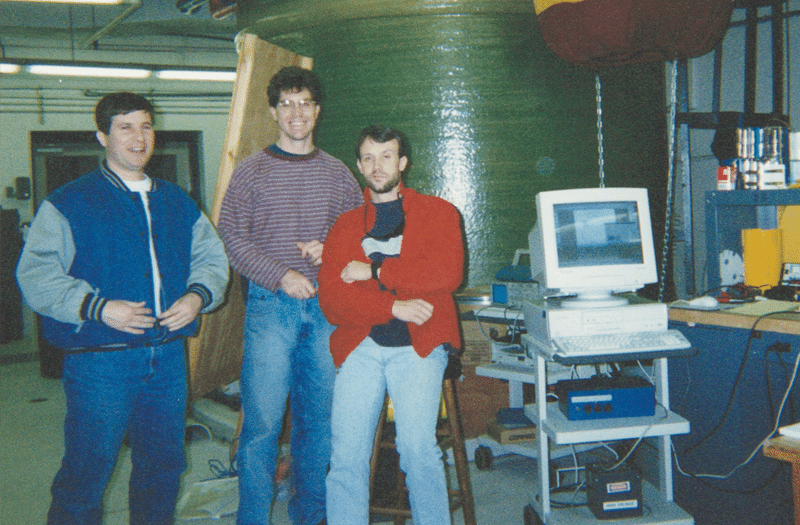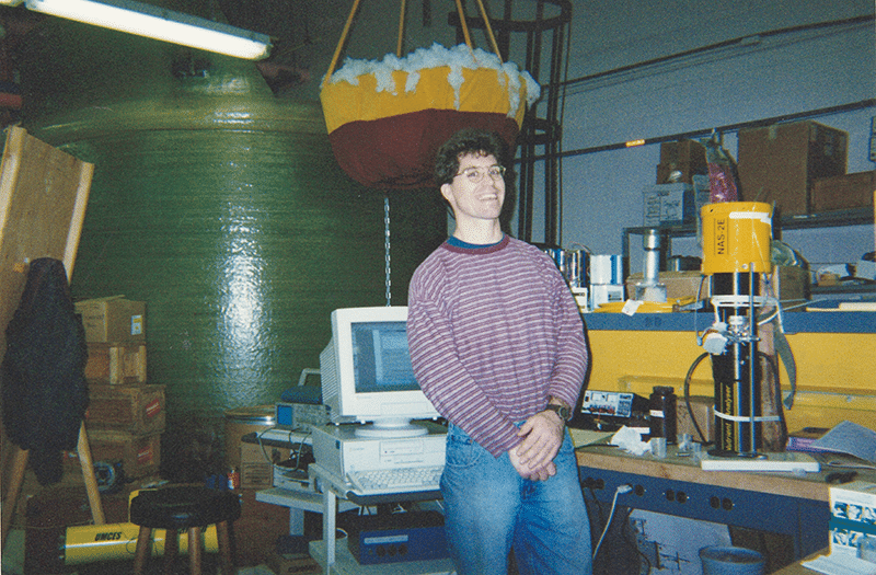 Soon after arriving at UMCES, Vince found himself on the Choptank River deploying a high-tech nutrient monitoring instrument for his first real-world experiment. He was assisted by Bill Boicourt, who led the Chesapeake Bay Observing System—a pioneering network of instrumented buoys and monitoring stations in the Bay—and even served as a diver during the installation of the sensor on the buoy. When Vince later returned to retrieve the device, he discovered that part of the instrument had disappeared—the steel cable and $25,000 sensor had fallen into a 30-meter-deep hole off Castle Haven Point in the Choptank River.